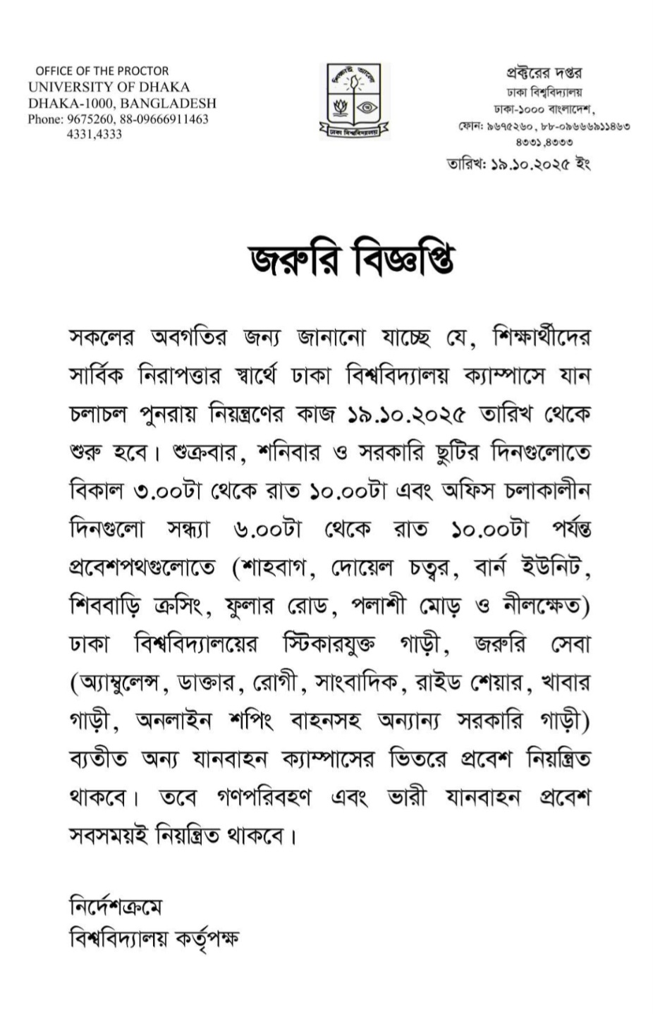 শুক্রবার (১৮ অক্টোবর) বিশ্ববিদ্যালয়ের প্রক্টর সহযোগী অধ্যাপক সাইফুদ্দীন আহমদের দপ্তর থেকে জারি করা জরুরি বিজ্ঞপ্তিতে জানানো হয়, নিরাপত্তার কারণে ক্যাম্পাসে যান চলাচল নিয়ন্ত্রিত থাকবে। শুক্রবার, শনিবার ও সরকারি ছুটির দিনগুলোতে বিকাল ৩টা থেকে রাত ১০টা পর্যন্ত, এবং অফিস চলাকালীন দিনগুলোতে সন্ধ্যা ৬টা থেকে রাত ১০টা পর্যন্ত প্রবেশপথগুলোতে (শাহবাগ, দোয়েল চত্বর, বার্ন ইউনিট, শিববাড়ি ক্রসিং, ফুলার রোড, পলাশী মোড় ও নীলক্ষেত) ঢাবির স্টিকারযুক্ত গাড়ি এবং জরুরি সেবা (অ্যাম্বুলেন্স, ডাক্তার, রোগী, সাংবাদিকসহ অন্যান্য সরকারি গাড়ি) ব্যতীত অন্য কোনো যানবাহন ক্যাম্পাসে প্রবেশ করতে পারবে না।